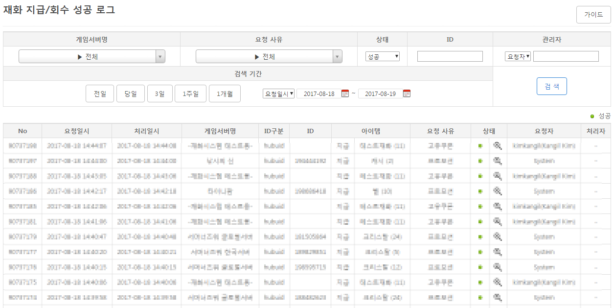 - Provides a log page where you can check the success or failure of delivering for the processing of game money and items.